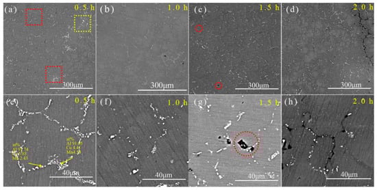 Figure 6 displays the microstructure evolution of the TiB2/Al–Cu–Mn–Cd composite (after pretreatment at 523 °C for 11 h) when heated at 535 °C for various periods (0.5–2 h). As seen in Figure 6a, the residual phase located in the triangle grain boundary further dissolved into the α (Al) matrix, and only a small amount of the residual phase existed in a local area (marked by dotted red boxes). Specifically, a lot of sub-micro phases were distributed discontinuously at the grain boundary, as shown in Figure 6e, and EDS point results indicated those phases consisted of Al, Cu and Mn elements. The phenomenon is consistent with the result of Ref. [], and the sub-micro phases can be considered as T (Al20Cu2Mn3) phase. The T (Al20Cu2Mn3) phase is a highly temperature stable phase, so it is hard to dissolve into the α (Al) matrix. Fortunately, the size of the T phase is relatively fine and doesn’t damage mechanical properties. With the solution time extended to 1 h, the residual phases located in the triangle grain boundary completely disappeared, which indicates that the residual phase located in the triangle grain boundary could be further dissolved by increasing the second-stage solution temperature to 535 °C and holding for 1 h, as displayed in Figure 6b,f. However, after further extending to 1.5 h and 2 h, over-burning defects (marked by dotted red circles) appeared in the microstructure, as displayed in Figure 6c,d, and can be obviously observed in the enlarged images in Figure 6g,h, which indicates that the solution temperature exceeded the melting point of the residual phase. Therefore, treatment at 535 °C for 1 h is the optimal second-stage solution treatment.