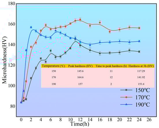 Figure 7 shows the variations of the hardness with the increasing aging times at 150 °C, 170 °C and 190 °C. Each data point represents an average of five measurements, with standard deviation shown as error bars. Hardening curves at 150 °C, 170 °C and 190 °C were quite similar. Initially, a particularly rapid increase appeared in the hardness curves at the three different aging temperatures. As the aging continued, peak hardness was achieved with 145.6 HV at 15 °C, 164 HV at 170 °C and 157 HV at 19 °C. Towards the later stages, the hardness values slightly declined but remained consistent. Comparing the hardness curves at 15 °C, 170 °C and 190 °C, the peak hardness at 170 °C was the highest and at 150 °C was the lowest. However, in terms of aging response, the composite aged at 190 °C required less time to reach the peak hardness. Based on the above hardness curves results, aging at 170 °C for 12 h is the optimal aging treatment.