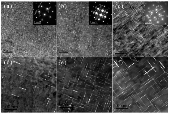 Reportedly, heat treatment can enhance the strength of Al–Cu alloys, resulting in formation of metastable precipitates. For Al–Cu alloys, θ′ phase is the dominating precipitate, and the precipitation sequence is Alss→Guinier–Preston (GP I zones)→θ″ (GP II zones)→θ′ (Al2Cu)→θ (Al2Cu) [,]. Therefore, it was necessary to observe the type, size and quantity of the dominating precipitates in the peak-aged composite. Figure 8 displays the TEM micrograph and SAED results of the peak-aged TiB2/Al–Cu–Mn–Cd composite at the different aging temperatures. As displayed in Figure 8a–c, nanoscale plate-like precipitates with high densities were evident in the peak-aged composite, which could be identified as θ″ and θ′ []. The corresponding SAED were performed to determine the type of precipitates, as shown in the upper-right corner of Figure 8a–c. The SAED pattern in Figure 8a shows that a series of weak streaks appeared around {002}Al spots, which indicates that the dominating plate-like precipitates of the peak-aged state at 150 °C were θ″. With the aging temperature increased to 170 °C, apart from the weak streaks caused by θ″, spots representing θ′ (marked by white arrows in the SAED pattern) could also be observed, as displayed in Figure 8b. The above SAED results indicate that the plate-like precipitates were composed of θ′ and θ″. Meanwhile, compared to the plate-like precipitates in Figure 8a,d, the number density of the plate-like precipitates in Figure 8b,e is less than in the aging treatment at 150 °C. The number density of plate-like precipitates further decreased when the aging temperature increased to 190 °C, as shown in Figure 8c,f. In addition, the SAED pattern in Figure 8c reveals that the weak streaks around the {002} Al spots disappeared, and the spots representing θ′ became more obvious. This phenomenon manifests that most of the plate-like precipitates were θ′ after the aging treatment at 190 °C for 2 h.