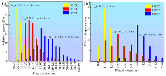 Figure 9 shows the diameter and thickness distribution of the plate-like precipitates. With the aging temperature increasing from 150 °C to 190 °C, the average diameter of the plate-like precipitates in the peak-aged state increased from 34.6 nm to 102.4 nm, and the average thickness of the precipitates in the peak-aged state increased from 2.4 nm to 3.2 nm, as displayed in Figure 9a,b. Specifically, comparing the size distribution at the different aging temperatures, the size of the plate-like precipitates treated at 170 °C were more uniform, with an average diameter of 64.3 nm and a thickness of 2.6 nm.