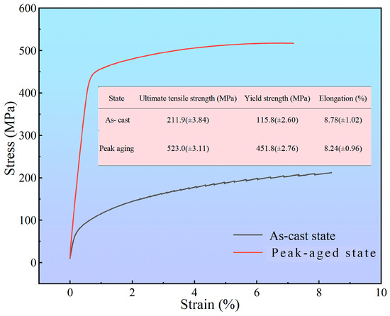 The average ultimate tensile strength (UTS), yield strength (YS) and elongation (EL) in the different states are exhibited in Figure 10. The UTS, YS and EL of the as-cast composite were 211.9 MPa, 115.8 MPa and 8.38%, respectively. After taking the above optimal heat treatment (first-step solution at 523 °C for 11 h followed by second-step solution at 535 °C for 1.0 h and aged at 170 °C for 12 h), the UTS and YS reached 523.0 MPa and 451.8 MPa, respectively. However, the value of EL slightly decreased from 8.78% to 8.24%