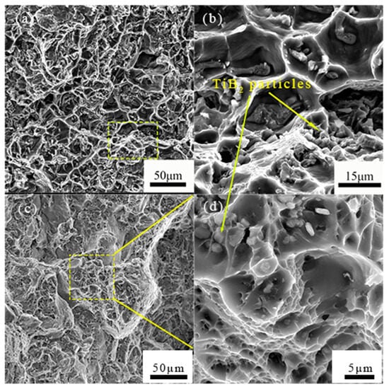Figure 11 displays the fractograph of the TiB2/Al–Cu–Mn–Cd composite in the as-cast and peak-aged states. As shown in Figure 11a,c, abundant tear edges are observed in Figure 11a, indicting a shear fracture mode. With adoption of the heat treatment, small dimple and cleavage planes simultaneously appeared, implying that the fracture mode had changed to a shear/cleavage mixed mode [], as displayed in Figure 11c. Particularly, Figure 11b,d show that TiB2 particles appeared in the center of a small dimple (as marked by yellow arrows), manifesting that the TiB2 particles played the role of bearing stress during the deformation and fracture process.