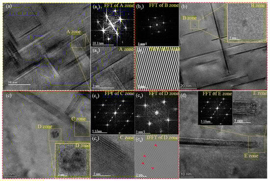 In the aspect of the structure evolution for the Cd-rich precipitates, it is worth noting that the Cd-rich precipitates cannot observed in Figure 14a. According to Ref. [], after APT results had confirmed that Cd existed in a matrix in the form of nano-scale atomic clusters precursor in the early aging stage, Cd could not be observed by HRTEM owing to lower resolution. With the aging time extended to 3 h, the Cd-rich precipitates could be observed in the HRTEM images, as shown in Figure 14b. The enlarged image of the B zone (shown in the top right illustration) showed that the Cd-rich precipitates with diameters of 2~3 nm maintained completely coherent interface relationships. The FFT pattern of the Cd-rich precipitates was consistent with the interface characteristics, as shown in Figure 14b1. No additional sets of diffraction spots arose in the FFT pattern, apart from the spots caused by the Al matrix. The IFFT result of the B zone in Figure 14b2 indicated that lattice distortions did not generate around the interfaces in the α (Al) matrix ascribing to the coherent interfaces between the Cd-rich precipitates and the α (Al) matrix. The enlarged image of the D zone (shown in the illustration of Figure 14c) showed the structure of the Cd-rich precipitates aged at 170 °C for 12 h, and the sizes of the Cd-rich precipitates had increased to 8~10 nm. Compared to the FFT result in Figure 14b1, there were still no extra spots caused by the Cd-rich precipitates. However, the spots caused by the α (Al) matrix became more blurry, as displayed in Figure 14c3. The IFFT result of the D zone showed that severe lattice distortion had occurred inside and around the Cd-rich precipitates, as marked by the “T” red signs in Figure 14c4, which can reasonably explain the blurriness in Figure 14c3.