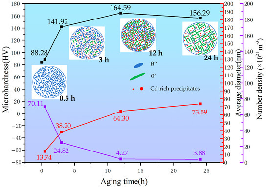 To deeply clarify the evolution of the microstructure and microhardness during the aging process, the relationship curves between the microhardness and the precipitates characteristics and a schematic diagram of the microstructure evolution are presented in Figure 15. As shown in Figure 15, in the beginning of the aging treatment (0.5 h), the θ″ precipitates with an average diameter of 13.74 nm had nucleated in the Al matrix, and the number density reached 7.011 × 1022 m−3. It is well known that the growth process of θ″ is determined by the diffusion of Cu atoms []. The growth of θ″ was hindered because Cu atoms could not be supplied by diffusion in the short aging period (0.5 h) to meet the needs of θ″ growth. So the sizes of the θ″ precipitates exhibited a finer morphology, as displayed in Figure 12a and Figure 14a. However, the sizes of the θ″ precipitates were too small, and the ability to hinder dislocation slip was poor. Meanwhile, the Cd-rich precipitates existed in the matrix in the form of precursor clusters in the early aging stage (0.5 h), so precipitation strengthening from the Cd-rich precipitates was minimal. Therefore, owing to the fine morphology of θ″ and the lack of precipitation strengthening of the Cd-rich precipitates, the hardness value of the composite was only 88.28 HV and in under-aged condition at 0.5 h. As displayed in the schematic diagram of the microstructure, the precipitation strengthening contribution of the composites aged for 0.5 h mainly arose from the θ″ precipitates.