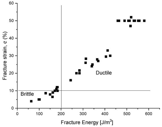 The strength–ductility trade-off is represented as a hyperboloid function relationship [] of the two parameters: the higher the strength, the lower the ductility. After stress, the ductility can be characterized by the following measurable parameters: elongation at break (ε (%)), reduction in cross-sectional area at break, energy absorbed up to break, and strain hardening exponent (n) determined from the true stress–strain diagram. Elongation to fracture seems to be the easiest to apply in practice, but since the majority of the samples in the literature have been tested for compression rather than tension, it is better to discuss the fracture strain to characterize the degree of deformation until fracture. This, however, is very contingent in terms of its extent, so it is only a qualitative characteristic, and it was necessary to find its quantitative substitute in this work.