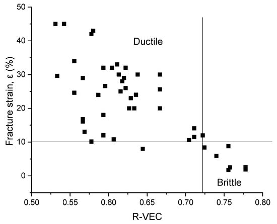The VEC~4.2 criterion: Qi and Chrzan [] proposed that the intrinsic ductility of a bcc refractory alloy could be estimated based on VEC. They showed that Mo- and W-based alloys could become intrinsically ductile if their average valence electron numbers were decreased by alloying. Moreover, Sheikh et al. [] demonstrated a ductility around VEC = 4.2, proposing the idea of metastability engineering. Changing the composition of the alloy, the brittleness increased as the VEC value increased from 4 to 6 []. Exploiting the transformation induced plasticity (TRIP), the ductilization of BCC–RHEAs was obtained by alloying, reducing the VEC to 4.2 [,].