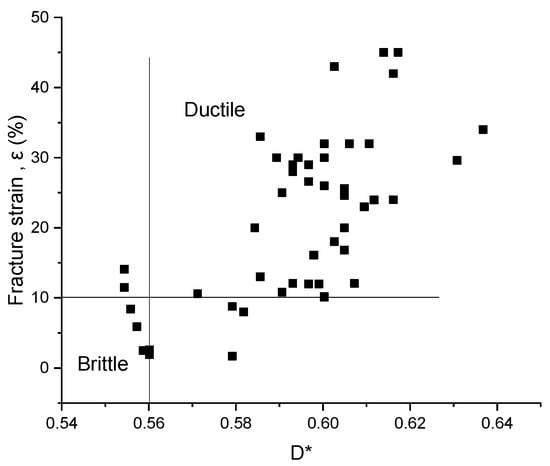 In practice, D* varies between 0.25 and 1 while ν varies between 0.2 and 0.5. D* = 1 corresponds to perfect ductility and D = 0 to total brittleness. The critical value for the In general, Poisson ratio ν > 0.28 and D* > 043 means ductile. Representing the fracture strain as a function of D* (see Figure 3), the critical value for D* = 0.562. It should be mentioned that Formula (9) is valid for isotropic alloys only.