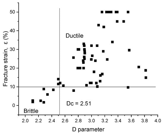 The survey of the most important ductility indices (DI) showed that no perfect B-D distinction can be made when these Dis are represented as a function of fraction strain, ε. Although ε is considered as the most direct DI, its value shows big variations as a function of the preparation and testing details of the given composition. The standard deviation of the ε data is significant and can reach 100%. Therefore, in the case of a large number of samples, data pairs also end up in the “forbidden” quadrants. In order to facilitate the D-B distinction, we recommend that the fraction strain, ε, be used only for qualitative checks to verify the correctness of the sorting. However, the sorting itself is conducted with DIs set in pairs, preferably so that the pairs consist of mutually scalable parameters.