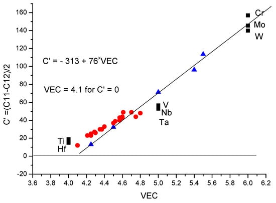 Valence electron counts dependent of the C′ component of the shear modulus for refractory metals and their alloys. Linear correlation was found between the valence electron counts and the C′ component of shear modulus for refractory metals and alloys. For alloys the data from [,] and for pure metals the tabulated data have been used.