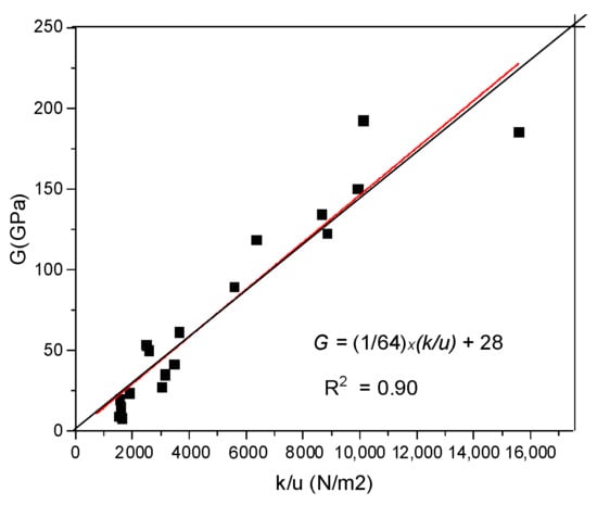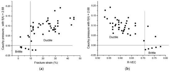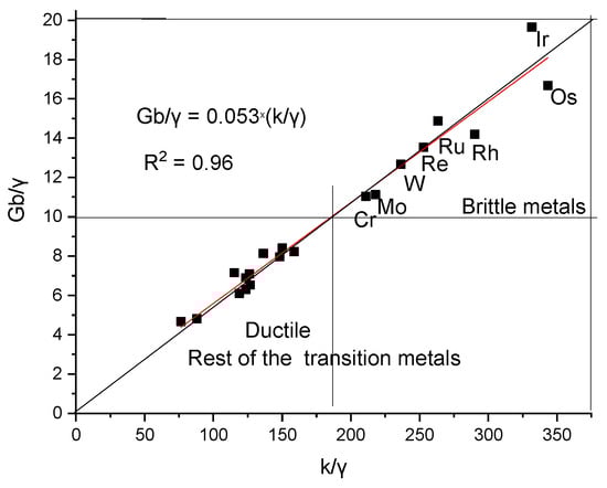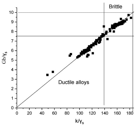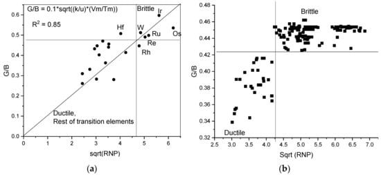 In practice, we have found that a better relationship can be obtained with the square root of RNP as a function of the “old” Pugh ratio, G/B. The result is shown in Figure 13, where the known brittle elemental metals are clearly delimitated from the ductile ones. A similar good delimitation was obtained for the refractory alloys dataset collected by Borg [] and Gorsee [,].
