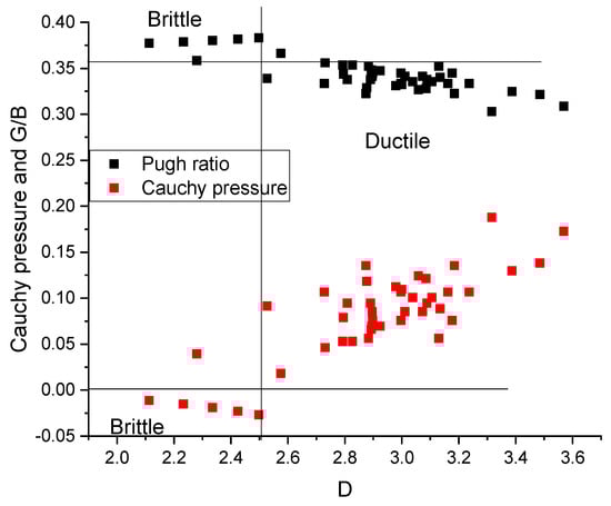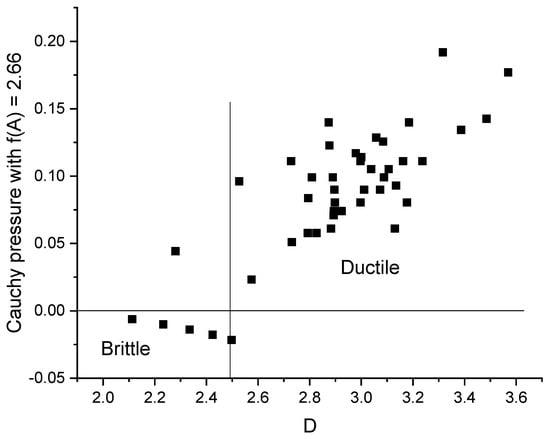 Unfortunately, the application of the oldest Pugh criterion also does not give better results (see Figure 9) in terms of classification according to B-D properties because the Pugh ratio is also dependent on anisotropy factor A, which can vary arbitrarily from sample to sample. Applying the Voigt–Reuss–Hill (VRH) approximation [], we obtained the following expressions for the shear and bulk moduli as a function of the C11, C12, and C44 elastic constants and Zener anisotropy A (see Equation (13)):