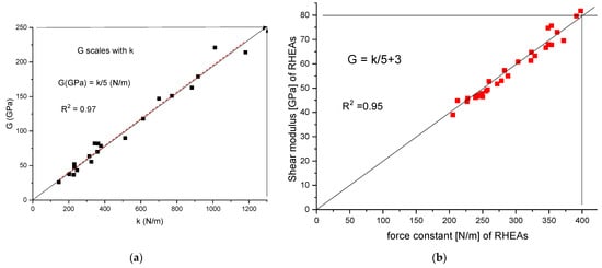 This singular point was around VEC = 4.1–4.2, both for elemental metals and alloys (see Figure 6). It turns out that for the elements at the beginnings of rows 3d–4d and 5d (VEC around 4), the anisotropy presented a large, singular point, and the critical G/B value was minimal, at 0.30. For VECs out of the singularity region, the C′ values differed from zero, and the critical G/B value achieved their normal values between 0.57 and 0.3. It should be mentioned that because of this VEC dependence of Zener anisotropy, it cannot be defined as a unique anisotropy factor (f(A)) for a set of samples with different VEC values. We recommend choosing, rather arbitrarily, the interval 0.26–0.28 for the minimal values of the Poisson ratio for the BCC–RHEAs. The corresponding interval or the critical value for G/B is 0.568–0.515, and for the anisotropy factor f(A), the interval is 1.76–1.941.