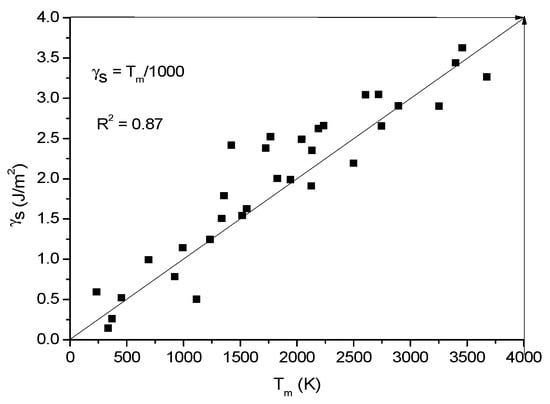 - Surface energy, γs, scales with Tm (γ = Tm/1000), where the unit of γ is J/m2 and that of Tm is K.