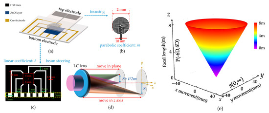 (a) 3D structure diagram of the device, (b) top electrode with electrode wire and gap are both 10 um; (c) bottom electrode, (d) movement of OAM LC lens focus, (e) focus moving area in 3D space (The color represents the focal length).