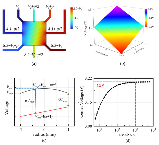(a) The whole region with Va is the minimum input voltage of the eight copper electrodes; p is the voltage increment in the X direction; (b) the core region of the bottom electrode; the color bars in (a,b) are used to display the voltage within the area (c) the voltage difference between the top and bottom electrode. the black line represents the top layer voltage distribution, the red line represents the bottom layer voltage distribution, and the green dashed line represents the voltage difference between the upper and lower electrodes; (d) the variation in center voltage with the sheet resistance (εr) ratio, the red and blue lines respectively represent the sheet resistance ratio and voltage value when the voltage is exactly stable.