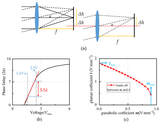 m: the parabolic coefficient (V·mm−2); t: the linear coefficient (V·mm−1); Vmax: the maximum voltage on the top electrode; Vmin: the minimum voltage on the top electrode; x (mm) is the position of a point within the aperture. To generate parabolic and planar phase profiles, all voltage difference values within the aperture must fall within the linear response region of the LC material [39]. If t = 0, the voltage difference within the aperture is a parabolic distribution to be a lens with a small wavefront RMS error (<0.05 λ).