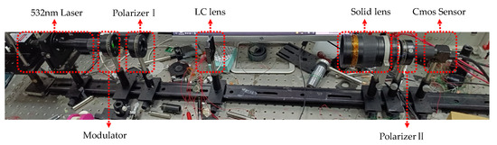 We designed two interference optical paths in Figure 4 and Figure 5 for the experiment. The device in Figure 4 was used to record the fringes to verify the feasibility of the OAM lens. The laser wavelength is 532 nm, and the modulator is used to adjust the intensity of the laser. When the laser passes through the polarizer I, it is decomposed into two orthogonal components. The first one sees the LC ordinary refractive index, which is uniform. However, the second one shows the LC’s extraordinary refractive index, which is affected by the applied voltages. The two components have phase differences; as they pass through the polarizer II, the interference fringes are captured by the CMOS camera.