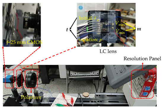 Image movement observation experimental setup, the prepared LC lens, and wire leads. The resolution panel is attached on the box for fixation.