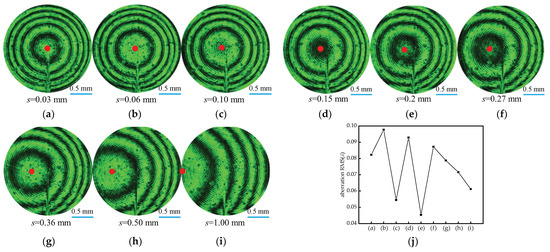 From Figure 9a–i, the lens shifts from the aperture center. The movement of the OAM lens Sfigure is recorded by pixels, compared with the theoretical value s. The aberrations of the OAM lens were recorded to verify its feasibility as a lens in Figure 9j, and the aberrations were all less than 0.1 λ, which demonstrates the good imaging performance of the proposed OAM LC lens. Therefore, when the OAM lens moves unidirectionally at critical conditions, the RMS error is no longer recorded.