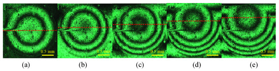 Finally, we demonstrated the multi-directional movement of the OAM lens within the aperture. In order to record fringes clearly, the m and t are fixed at 1.0 and 0.6, respectively. The constant movement of the optical axis is s = 0.3 mm. The interference fringes are captured during the optical axis shift in Figure 12a–e.