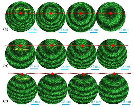 According to Equations (4) and (5), if the optical axis of the OAM lens is to be fixed, both m and t should be adjusted simultaneously to ensure that the position of the optical axis s remains constant. In this part, three fixed optical axis OAMs were recorded in Figure 11. The movements of the OAM lens are s = 0.25 mm, s = 0.5 mm, and s = 1.00 mm. The concrete values of m and t are listed in Table 4