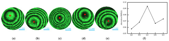 Interference fringes of the LC lens when the optical axis is shifted to different positions. (a–e) multiple directions, (f) the total RMS aberration of the OAM lens. The red dot is the center of the lens.