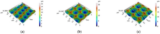 From Figure 4, it can be seen that under different cutting parameters and cutting conditions, the surface of the ball-end milling process presents pit-like topographical characteristics. The surface topography after ball-end milling will be affected by multiple factors such as cutting parameters, initial phase difference, tool vibration, etc. [12]. These influencing factors are coupled with each other to form the final surface topography, so it is difficult to analyse the topography characteristics of the machined surface based on single-factor experiments.