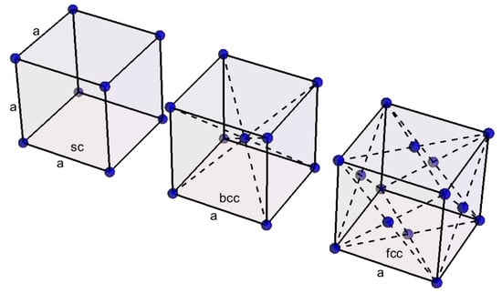 Even if it was assumed a simple cubic structure, this relationship is valid for face centered cubic (fcc) structure (see Figure 2) as well (cf. Appendix B). Erokhin and Kalashnikov [] proposed the above relation with another proportionality constant, because their work was based on another interatomic potential. A similar relationship was proposed by Trachenko et al. [] who pointed out that elastic constants are governed by the density of electromagnetic energy in condensed matter phases. As a consequence a relation between the bulk modulus and the binding energy was provided, resulting in a proportionality relation between the binding energy, the square of the sound velocity and the mass of the atom.