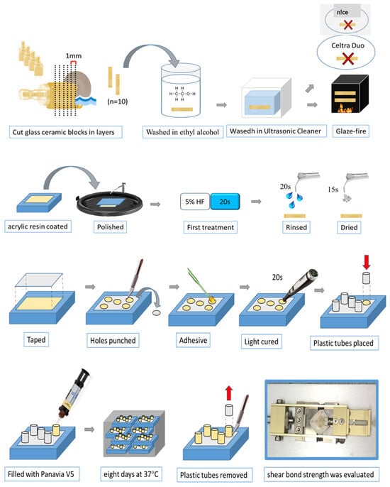 Schematic representation of the sample preparation showing cutting, polishing, adhesion step, and shear bond strength testing.