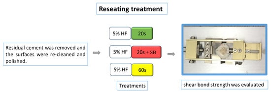 The aim of this study is to determine if there is a superior method for reseating de-bonded lithium disilicate-based glass ceramics through the use of universal resin cement. In other words, the reason for this investigation is to address the potential failure of dental restorations, such as crowns and bridges, due to microleakage or mechanical failure, despite the significant bond strength improvements provided by HF and silane treatments. Given the high cost of lithium silicate-based glass ceramics, if a restoration is not broken, the first course of action would be to attempt to re-cement these crowns rather than fabricate new ones. For this purpose, the shear bond strength of four different LSGCs was recorded after the initial cementation and again after the reseating treatments, which consisted of hydrofluoric acid for 20 s, sandblasting HF for 20 s, and HF for 60 s. The null hypothesis of this study was that there is no difference in shear bond strength between the three different recementation procedures.