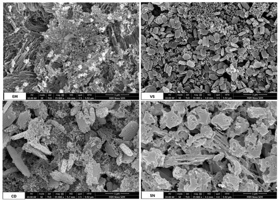 The scanning electron microscope (SEM) images in Figure 3 depict four different types of lithium silicate glass ceramics (LSGC) at a magnification of 35,000× under the influence of 5% hydrofluoric acid (HF). The LSGC types included in the images are EM (IPS e.max® CAD), VS (Vita Suprinity®), CD (Celtra Duo®), and SN (n!ce®). These SEM images offer valuable insights into the microstructural features and surface morphology of the LSGC materials, which are crucial for understanding their properties and potential applications in various fields. The impact of etching on surface roughness varies significantly among the different lithium silicate glass ceramics due to their distinct crystal morphologies. Etching with hydrofluoric acid resulted in increased surface roughness across all four types of lithium silicate-based glass ceramics (LSGC), altering the micromorphology of the ceramic surfaces by creating microporosities due to the chemical interaction between the hydrofluoric acid and the silica in the glass phase of the ceramics. The SEM images revealed that etched surfaces exhibited distinct patterns depending on the material; for example, Celtra Duo and n!ce displayed a honeycomb-like structure, while e.max CAD and Vita Suprinity showed needle-like shapes. The chemical reaction led to the removal of hexafluorosilicates, forming small porosities and resulting in an irregular roughness on the surface. Overall, hydrofluoric acid etching effectively modified the surface characteristics, enhancing micromechanical retention and potentially improving bonding with resin cements.