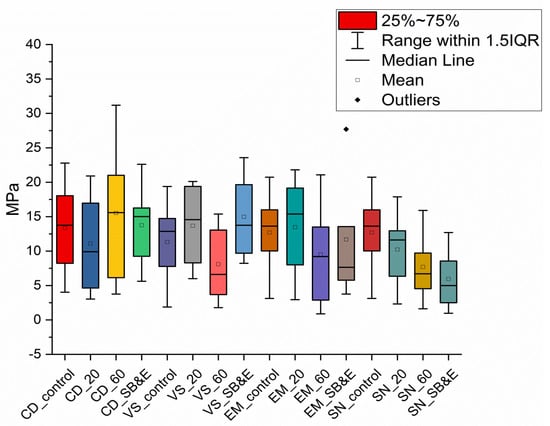 Descriptive statistic results of the re-cemented samples compared with the first sitting bond strength. CD: Celtra Duo; VS: Vita Suprinity; EM: e.Max; SN: Straumman n!ce; Control: first sitting result; 20: etched for 20 s; 60: etched for 60 s; SB and E sandblasted and etched for 20 s.