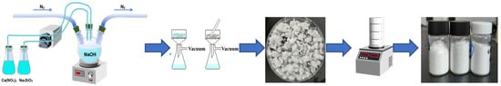 The experiment utilized reagents including Na2SiO3·9H2O, Ca(NO3)2·4H2O, NaOH, Pb(NO3)2, and Cr(NO3)3·9H2O. All of the reagents have analytical purity. Deionized water was boiled and then rapidly cooled to room temperature using an ice water bath for solution preparation. Na2SiO3 solution, Ca(NO3)2 solution, and 1.2 mol/L NaOH solution with different pH values were prepared. The mixing ratios are detailed in Table 1. The reaction apparatus is depicted in Figure 1. A high-purity N2 gas with a flow rate of 0.2 L/min was introduced into the system for 1 h to purge the air from the apparatus. The prepared solution was placed in a conical flask with a stopper and the flow of the solution was controlled solely through a peristaltic pump. The NaOH solution was quickly pumped into a three-neck flask using the peristaltic pump. Then Ca(NO3)2 and Na2SiO3 solutions were dripped into a three-necked flask containing the NaOH solution at a rate of 0.83 mL/min using a peristaltic pump, with stirring at 700–800 r/min, and titration completed at 25 ± 0.5 °C over 3 h. Then, two additional reaction hours followed. The entire reaction process was conducted under the N2 atmosphere. Solid–liquid separation was achieved through vacuum filtration, and a gel-like substance was obtained after three successive washes with deionized water and absolute alcohol. The samples were freeze-dried in a vacuum freeze dryer at −40 °C for 21 h to produce a fluffy powder, which was preserved in a sample bottle under vacuum.