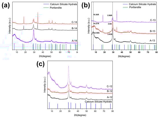 CSH gel samples with varying synthetic pH levels and Ca/Si were prepared in order to investigate the correlation between the formation of CSH gel and pH value. The XRD patterns of A-14, B-14, and C-14 are presented in Figure 2a. When the pH of the synthetic solution is 14, the XRD patterns of the CSH gel (B-14, C-14) exhibit diffraction peaks characteristic of portlandite, and the intensity of these peaks increases with an increase in Ca/Si.