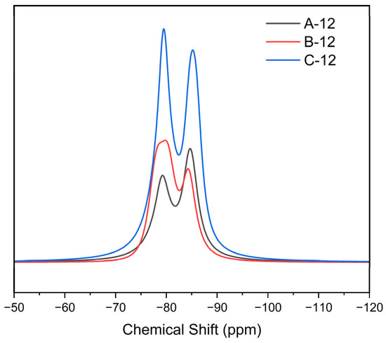 The SS29Si NMR of A-12, B-12, and C-12 was measured. As shown in Figure 3, the Q1 bond is located near −80 ppm, and the Q2 bond is located near −85 ppm. The peak intensity of the Q1 bond shows a trend of increasing with the increase in Ca/Si, while the Q2 bond shows a trend of decreasing first and then increasing with Ca/Si. The Si-O bond’s mean chain length (MCL) was calculated by Formula (1). The relative proportion of Qn can be obtained from the deconvolution of spectra performed by a mixed Lorentz–Gauss peak profile [35].