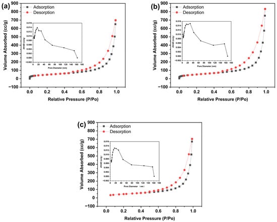 Adsorption–desorption isotherms of different Ca/Si CSH gels at pH 12 for (a) A-12, (b) B-12, and (c) C-12.