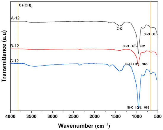 The FT-IR spectra of A-12, B-12, and C-12 showed strong bands at 1410, 960, and 670 cm−1 [42], corresponding to the C-O bond and the Si-O bond Q2 and Q1 of the CSH gel silicon tetrahedra, respectively (Figure 6). According to the literature, the band of Ca(OH)2 is located at 3750 cm−1, and the band of the H-O bond is at 3490 cm−1 [43,44]. In CSH gels with different Ca/Si (A-12, B-12, C-12), the bands of Ca(OH)2 did not appear, indicating that the synthesized CSH gel did not contain portlandite, corroborated with the XRD results (Figure 2). In Figure 6, the intensity of the Q2 band for A-12, B-12, and C-12 is higher than that of Q1. With the increase in Ca/Si, the band of Q1 shows a trend of first decreasing and then increasing, with the Q2 band at 962 cm−1 for A-12 initially shifting to 965 cm−1 for B-12 and then to 963 cm−1 for C-12. Combined with Raman and SSNMR, it is concluded that the phenomenon of Si-O bonds moved first to higher wavenumbers and then to lower wavenumbers. It indicates that the degree of polymerization of the silicon chain in the CSH gel first increases and then decreases.