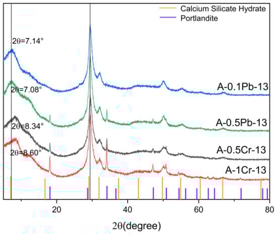 According to the proportions listed in Table 2, CSH gel with immobilized heavy metal ions was prepared. The existence of heavy metal ions Pb2+ and Cr3+ within the CSH gel was confirmed through XRF analysis. Specifically, the proportion of CSH gel immobilization with Pb ions relative to the total elements stands at A-0.1Pb-12/A-0.5Pb-12/B-0.5Pb-12/C-0.5Pb-12 = 0.96%/0.12%/0.55%/0.12%, whereas the proportion of CSH gel immobilization with Cr ions comprises A-0.5Cr-12/A-1Cr-12/B-1Cr-12/C-1Cr-12 = 1.74%/1.12%/1.90%/1.85%. XRF data indicate that the immobilization effect of CSH gel on Cr3+ is greater than Pb2+. With the increase in concentration of heavy metal ions in the solution, the immobilization ability of CSH gel for both Cr3+ and Pb2+ decreases. Qiao et al. [46] demonstrated through simulation calculations that the immobilization effect of CSH gel on heavy metal ions was Pb > Zn > Cu, which was related to the shrinkage of CSH gel. It has been shown in the literature that CSH gel has a higher immobilization capacity for Pb2+ than Cr3+ [47,48]. However, some researchers believe that during the early hydration process, a low concentration of Cr promotes the formation of CSH gel [49]. The immobilization of heavy metals mainly depends on the complex pore structure and is affected by various factors such as curing time, the role of metal cations, and internal pH value. Therefore, it is not accurate to evaluate the immobilization ability of CSH gel to heavy metal ions through XRF data, which can only confirm the successful immobilization of heavy metal ions by CSH gel. The obtained samples were subjected to X-ray diffraction analyses (Figure 8). Peaks of portlandite appeared in A-0.5Pb-13, A-0.5Cr-13, and A-1Cr-13, indicating that Ca2+ in the CSH gel was substituted. The absence of portlandite peaks in A-0.1Pb-13 may be due to a lower immobilization amount. In the samples A-0.1Pb-13, A-0.5Pb-13, A-0.5Cr-13, and A-1Cr-13, where Pb2+ and Cr3+ were immobilized, the peak at 2θ = 7.14° shifted to 2θ = 7.08°, 2θ = 8.34°, and 2θ = 8.60°, respectively. The interplanar spacings were found to be 12.371 Å, 12.476 Å, 10.593 Å, and 10.274 Å. The trend of interplanar spacing exhibited an initial increase followed by a decrease. In contrast, the peak for A-13 in Figure 2b is located at 2θ = 7.20°. This peak shows a slight shift towards lower angles after Pb immobilization and a shift towards higher angles after Cr immobilization, both with increasing immobilization amounts. The ionic radii of Pb2+, Cr3+, and Ca2+ are in the order of Pb2+ > Ca2+ > Cr3+, indicating that the substitution of Ca2+ by Pb2+ leads to an increase in interlayer spacing, while the substitution by Cr3+ leads to a decrease, aligning with the peak shifts in A-0.1Pb-13, A-0.5Pb-13, A-0.5Cr-13, and A-1Cr-13. Therefore, the formation of new phases, as identified in XRD analyses, is attributed to the entry of heavy metal ions into the interlayer structure of CSH, replacing Ca2+, which in turn reacts with NaOH.