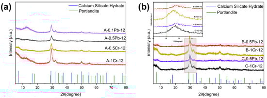 XRD patterns of CSH gel immobilized metal ions with different calcium–silicon ratios (a) A-0.1Pb-12 and A-0.5Pb-12 for immobilized Pb, and A-0.5Cr-12 and A-1Cr-12 for Cr; (b) B-0.5Pb-12 and C-0.5Pb-12 for immobilized Pb, and B-1Cr-12 and C-1Cr-12 for immobilized Cr.
