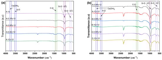 FTIR spectra of CSH immobilized heavy metals (a) A-12, A-0.1Pb-12, A-0.5Pb-12, A-0.5Cr-12, A-1Cr-12; (b) A-0.5Pb-12, A-1Cr-12, B-0.5Pb-12, B-1Cr-12, C-0.5Pb-12, C-1Cr-12.