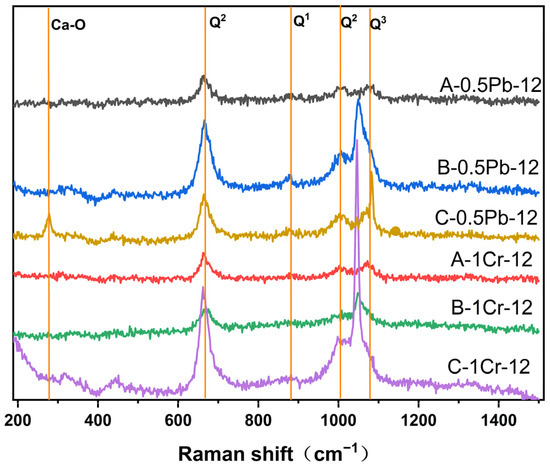 Raman spectroscopy has arrived at comparable conclusions, as depicted in Figure 11. The image shows no appreciable displacement in the Q1 and Q2 bonds. The Q3 bond of A-0.5Pb-12 and A-1Cr-12 is situated at 1056 cm−1, whereas B-0.5Pb-12 exhibits a shift to 1051 cm−1, and C-1Cr-12 demonstrates a shift to 1048 cm−1. Furthermore, a notable enhancement in peak intensity is evident in B-1Cr-12 and C-1Cr-12. This phenomenon suggests that as the Ca/Si increases, the proportion of the Q3 bond decreases in the CSH that has immobilized heavy metals, resulting in a decrease in the polymerization degree of the silicon chain. Notably, the CSH gel immobilized with Cr3+ (B-1Cr-12, C-1Cr-12) exhibits a higher intensity of Q3 bonds compared to the CSH gel immobilized with Pb2+ (B-0.5Pb-12, C-0.5Pb-12). It is inferred from the literature that Cr3+ can not only replace Ca2+ but also exhibits a certain degree of substitution for Si4+ [49,51].