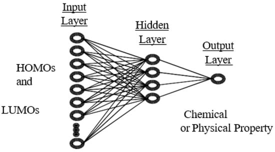 Artificial intelligence (AI) via artificial neural networks (ANNs) consists in parallel types of computing systems. The main structure of ANNs is a highly interconnected network of simple processing elements known as nodes. A popular configuration for a supervised feed-forward back-propagating neural network is three main layers. The first layer, called the input layer, receives all of the input data. Next, there is a hidden layer; its function is to perform the desired mapping between the input and output layers. Finally, there is the output layer, where the network gives its predicted value. There are generally multiple input nodes connected to multiple hidden nodes connected to one or more output nodes (see Figure 1). In our study, we use the lowest 20 unoccupied molecular orbitals and the highest 20 occupied molecular orbitals that surround the orbital gap. Each input node’s value is adjusted by a weight before reaching the hidden layer where all products of inputs multiplied by weights are summed. This sum is transformed by a nonlinear activation function, which scales the summation to an appropriate nodal value. If the hidden node’s value is less than a specified threshold value, it will remain inactive and does not contribute to the next layer. However, if the hidden node’s value is greater than the threshold value, it will be adjusted by another weight and summed with all other adjusted hidden nodes that met the threshold criteria. The new summation will be transformed to represent the output layer, where the predicted value is compared to the correct value. These errors are back-propagated, before weight adjustment, through the network to the input layer. This forward and backward training process continues until a convergence is achieved. It is this feature of propagating the error backwards through the network which is responsible for the network being referred to as a backpropagation neural network.