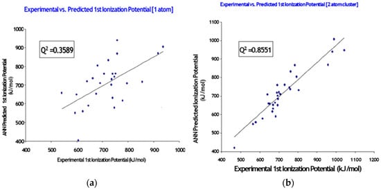 Figure 2a,b represent the ability of the ANN to predict the bulk materials’ first Ionization Potential based on data describing one- and two-atom systems from which the bulk materials are composed. Figure 2a represents the predictions made using orbital data obtained from a single atom of the corresponding bulk material. Figure 2b represents the predictions made using orbital data obtained from two atoms of the corresponding bulk material, modeled as homogeneous diatomic molecules. Note that the Q2 value for the single-atom modeling was 0.3589. The value of Q2 for the diatomic system increased significantly to 0.8551.