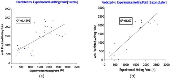Figure 3a,b represent the ability of the AI to predict the melting point of bulk materials using orbital data obtained from atoms and homogeneous diatomic clusters. Figure 3a represents predictions made using atomic orbital parameters. Figure 3b represents the predictions made using diatomic orbital parameters. A similar increase in Q2 was also observed for the melting point predictions. The single-atom series yielded a Q2 of 0.4599 in contrast with the diatomic series melting point predictions which exhibited a Q2 of 0.8207.