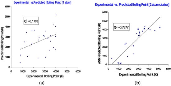 Figure 4a,b represent the ability of the AI to predict the boiling point of bulk materials using orbital data of atoms and homogeneous diatomic clusters. Figure 4a represents boiling point predictions made using single-atom orbital parameters resulting in a Q2 of 0.1798. Figure 4b represents the boiling point predictions made using diatomic orbital parameters with a Q2 value of 0.7877.