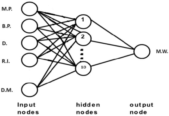 In this part of our study, we trained our AI software on 66 different molecules on which the corresponding boiling point (B.P.), melting point (M.P), refractive index (R.I), density (D), and dipole moment (D.M.) were provided and then asked for “trained” AI to predict the molecular weights for an additional four compounds. We used the learning algorithm technique of feed-forward backpropagation using software developed by NASA and modified by us [11]. Figure 5 illustrates the AI network used in the training and prediction of molecular weights (M.W.) from the physical properties of melting point (M.P.), boiling point (B.P.), density (D.), refractive index (R.I.), and dipole moment (D.M.).