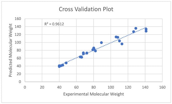 The following cross-validation plot (Figure 6) illustrates the results of the prediction of the molecular weights of various organic molecules using the physical properties of melting point, boiling point, refractive index, density, and dipole moment.