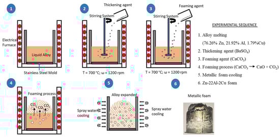 The Zn-22Al-2Cu alloy was manufactured from pure metals in a gas furnace at 750 °C. Zinc was added at the end of melting due to its low melting point, to minimize oxidation losses. The chemical composition of the alloy produced was 76.26 wt. % Zn, 21.92 wt. % Al, and 1.79 wt. % Cu. Figure 1 shows a scheme of the experimental process followed to obtain a Zn-22Al-2Cu closed-cell foam. Furthermore, 500 g of the zinc-base alloy was set in a bipartite stainless-steel mold and melted at 700 °C in an electric furnace. The furnace has a stirring system to carry out the thickening and foaming stages. The thickening stage was developed by adding 0.5, 1, and 1.5 wt. % of barite of the mass charge at 1200 rpm for 2 min. Afterward, the foaming stage consisted of the addition of 1 wt. % of the mass charge of reagent grade CaCO3 (Fermont, 98.5% purity and 14 µm of particle mean size) to the melt at 1200 rpm for 100 s. Later, the stirring system is removed, and the melt expands to obtain the metallic foam. After the foam reaches the highest expansion, the mold is extracted and cooled with sprayed water.