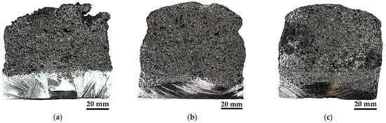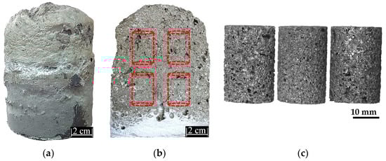 A zinc-base alloy foam is shown in Figure 2. It shows an external oxidation of the foam (Figure 2a), where particles and dross are mainly located on the top surface. A cross-section of the foam (Figure 2b) exhibits the cell structure and pore morphology. The top foam surface is removed, and samples are obtained to evaluate density, cell structure, and compression resistance. Figure 2b shows the foam regions where the cylindrical samples (20 mm diameter and 30 mm height) were extracted for compression trials and microstructural characterization (Figure 2c).