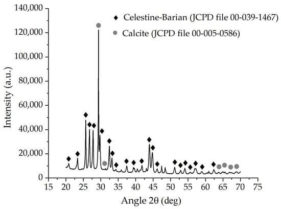 The X-ray diffraction pattern of the barite sample is reported in Figure 4, and it is confirmed using the results obtained from the SEM-EDS techniques, where the Celestine–Barian compound (Ba0.25Sr0.75SO4) was detected as the main compound, while calcite (CaCO3) was detected in lower concentrations as the main impurity in the barite sample.